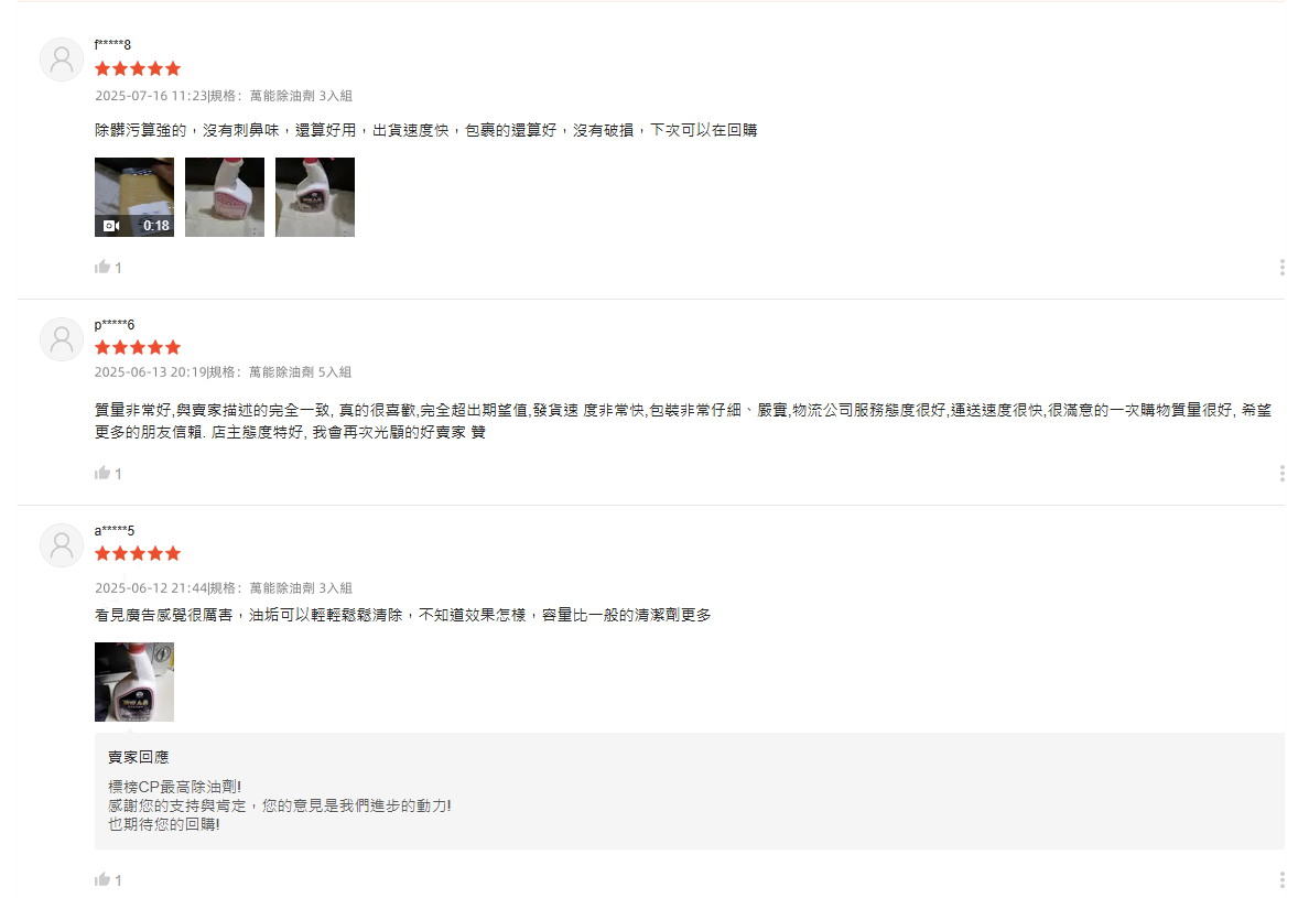 2分鐘前【夜市人生清潔劑】-(夜市人生水垢還原劑)適合各處殘留水垢,只清水垢,不傷手/不刺鼻,只要有水垢的地方通通清的起來!【夜市人生萬能除油劑】廚房救星!❗油污秒殺❗ 噴後10秒擦淨|網友狂推|頑固油漬剋星|輕鬆分解重油污 - 台灣製【夜市人生萬能除油劑】好用不傷手 買三送三 6組分享裝NT$1380(單瓶NT$230)