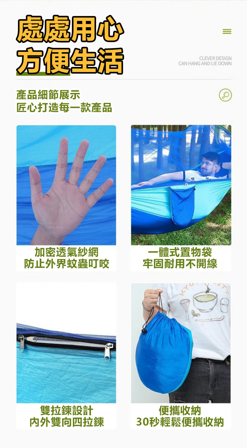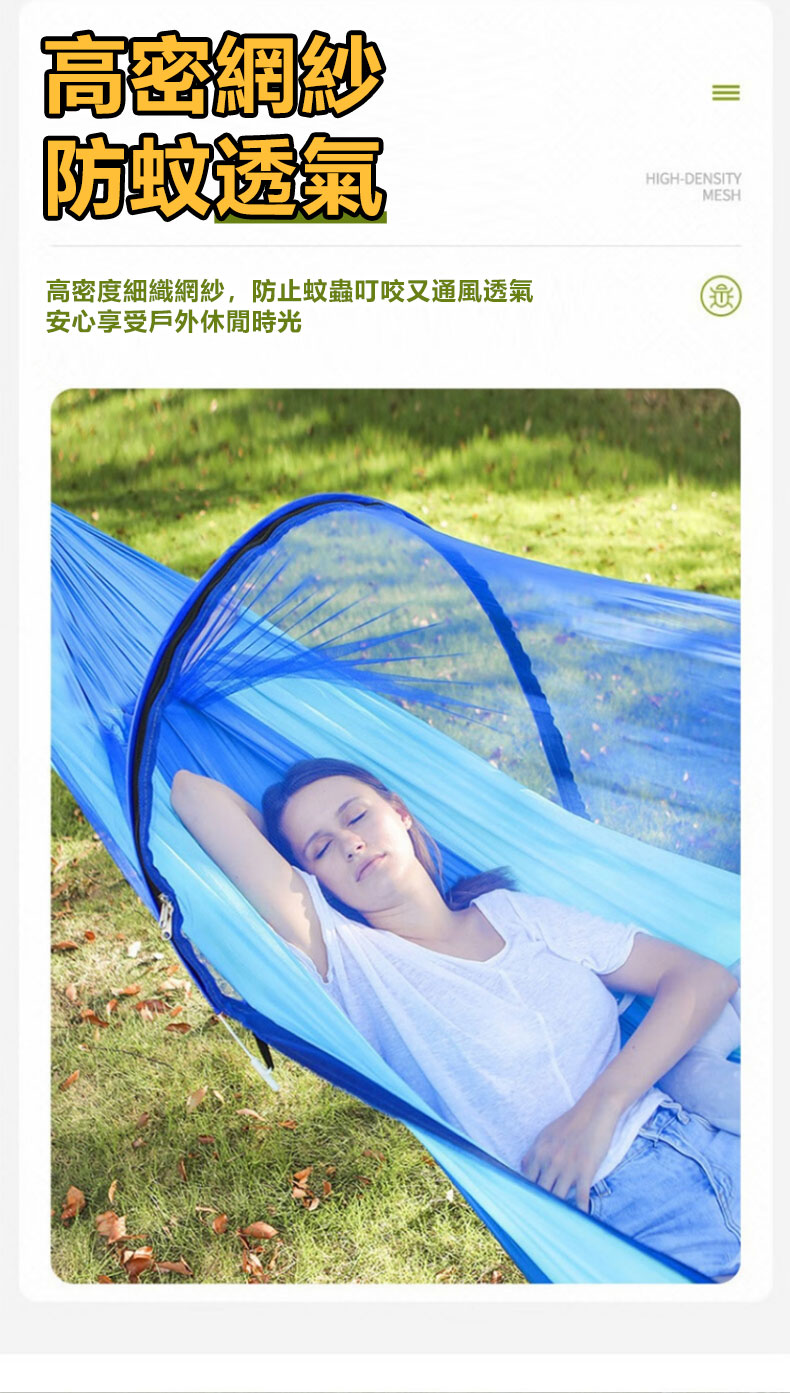 11分鐘前全自動速開戶外帶蚊帳吊床 - 【創意嘗鮮】承重700公斤 速開蚊帳吊床【帶蚊帳 三米綁繩 8號扣】/1入組NT$1298