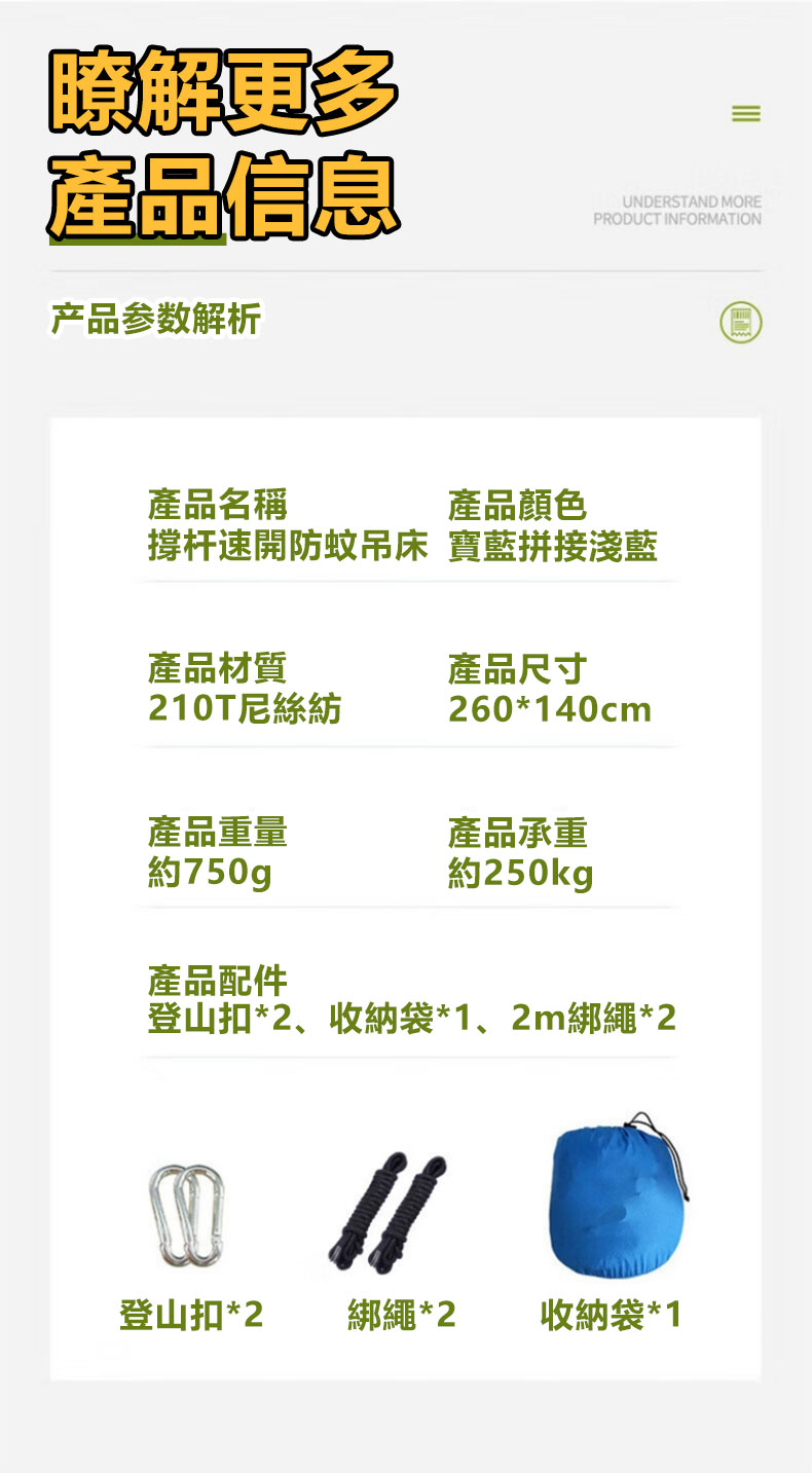 25分鐘前全自動速開戶外帶蚊帳吊床 - 【限時下殺】承重700公斤 速開蚊帳吊床【帶蚊帳 三米綁繩 8號扣】/2入組NT$2098